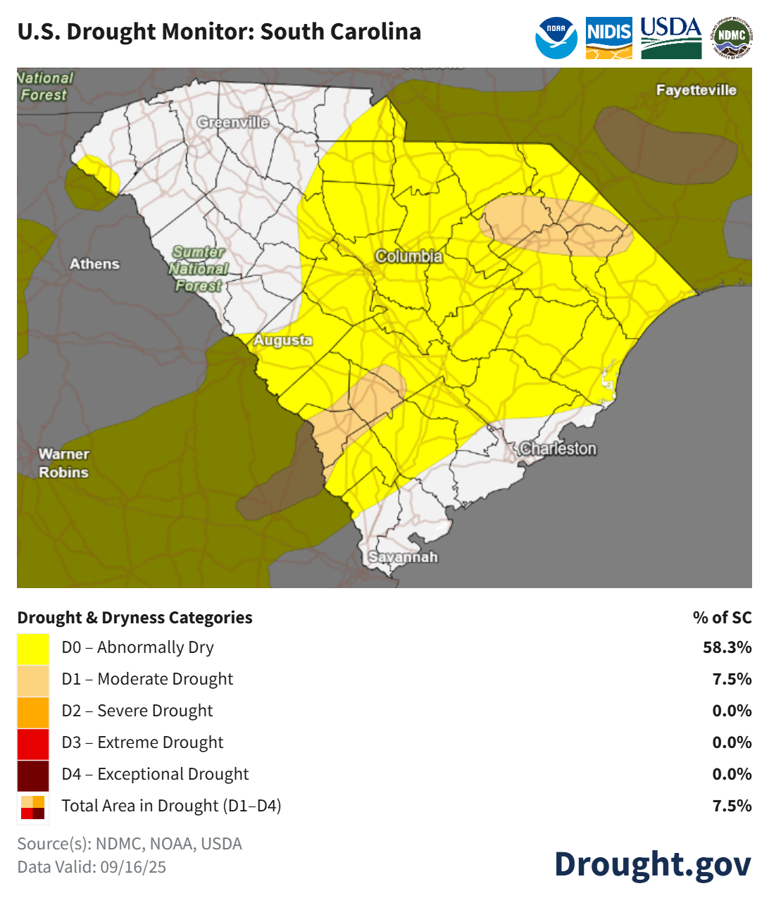 As a result, drought has returned to parts of South Carolina, with over half the state experiencing abnormally dry conditions.