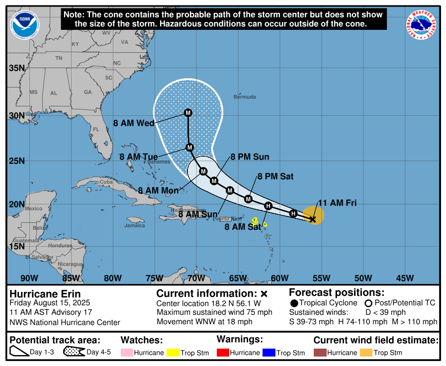 That’s good because NHC is calling for Erin to be a Category 3 hurricane while passing between the uprights next week. That makes sense because Erin will find increasingly warmer waters as it moves to the area north of Hispaniola, and the vertical shear that has been plaguing it should relax. Hopefully, the forecast works out and we’ll breathe a sigh of relief watching it march through the Atlantic next week.