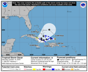 The forecast reasoning for this system hasn’t changed since yesterday, though. That it has become a tropical storm and might get a little stronger makes it more likely to turn northeastward and move over the Atlantic toward Bermuda next week, steered by an upper-level trough that will soon form off the Southeast Coast. However, that’s not a guarantee. If it weakens enough as it sits close to Cuba on Monday (maybe it moves further inland or into the more mountainous terrain over Cuba’s far south), then an alternate path would still be possible. That might allow Oscar to miss the connection with the upper-level trough. If that happens, it might wander into the northwestern Caribbean Sea or dissipate over Cuba. However, if that happens, a continued westward track into Central America would be likely. None of the current possibilities would result in any direct risk to South Carolina.