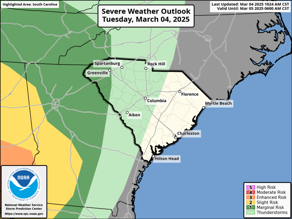 When SPC has you in a level 3 (enhanced) or higher area on their outlooks, they mean business. You’ll want to prepare this evening. For example, any loose items in your yard that can blow around should be secured. You’ll also want to take some time to review your tornado emergency plans, especially if you are in the enhanced risk area where the tornado risk will be highest. As always, you can find help with severe thunderstorm and tornado prep from SCEMD and the National Weather Service.