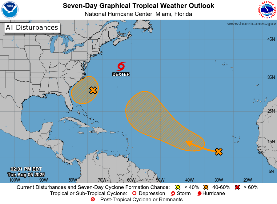 The Atlantic tropics have perked up in recent days with Tropical Storm Dexter forming east of the Outer Banks and moving out to sea. More favorable conditions are spreading across the basin as the Madden-Julian Oscillation (MJO) continues its eastward drift. So, this afternoon’s Tropical Weather Outlook graphic from the National Hurricane Center (NHC) has a busy look.