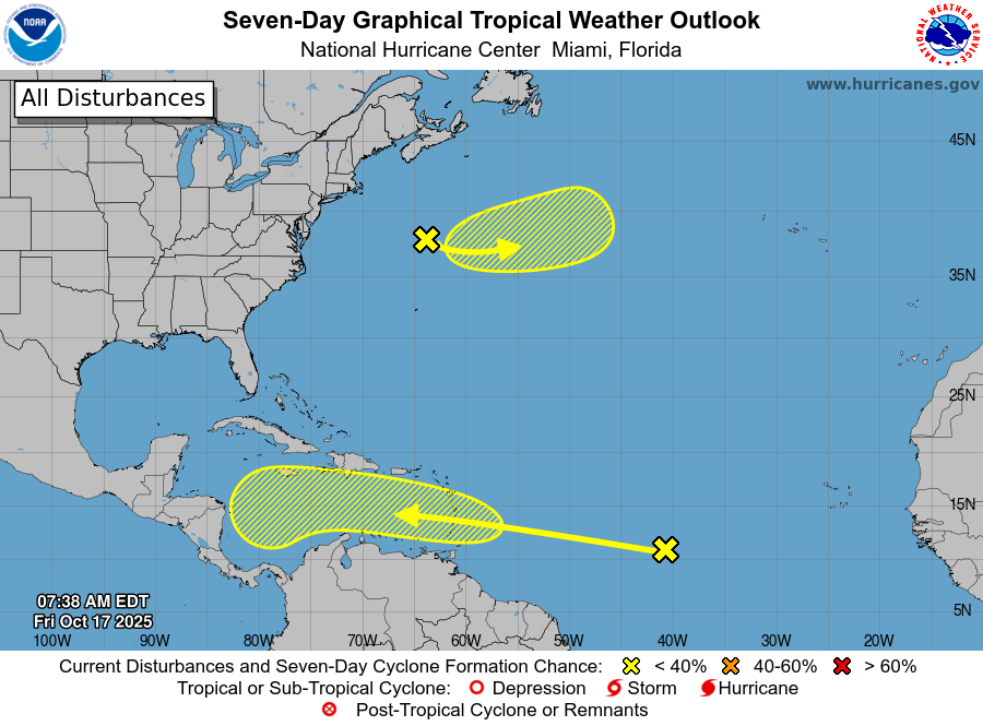 All is quiet on the Atlantic front today. We don’t have any named storms to track and only a few features of interest. That’s no surprise, as we are exiting the most active part of the hurricane season.