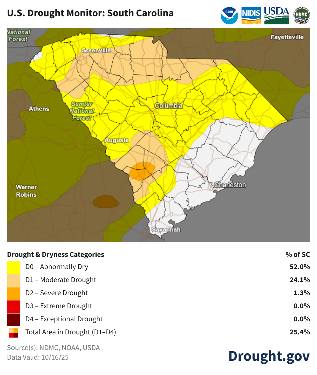 This week’s U. S. Drought Monitor shows an end to the drought near the coast, but dry conditions continue elsewhere in South Carolina; about a fourth of the state is in drought.