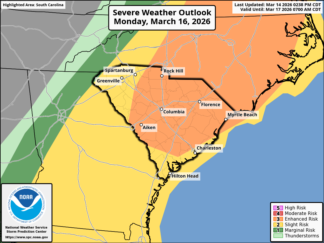 We remain on track for an outbreak of severe thunderstorms on Monday, capable of causing widespread damaging wind, large hail, and tornadoes. It still looks like the timing will be early in the day over the Upstate, possibly even before daybreak in the far west, through midday. The rest of the state will see the storms hit from midday through early evening. The worst of the severe storms is likely to occur over the Central Savannah River Area and the I-77 Corridor and eastward to the coast. Like with that 30% area on the Day 4 Outlook from SPC I showed you yesterday, the level 3 of 5 ‘enhanced’ risk area appearing on a Day 3 outlook is a ‘we mean business’ signal from SPC forecasters.