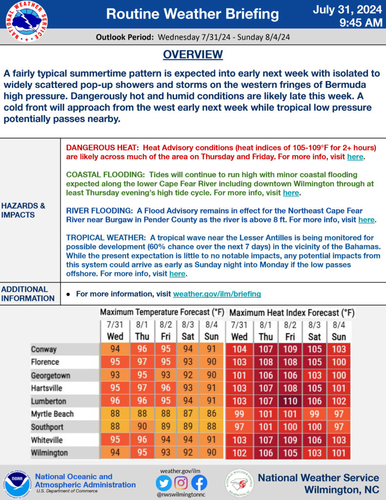 A fairly typical summertime pattern is expected into early next week with isolated to widely scattered pop-up showers and storms on the western fringes of Bermuda high pressure. Dangerously hot and humid conditions are likely late this week. A cold front will approach from the west early next week while tropical low pressure potentially passes nearby.