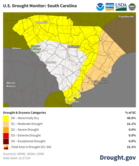 The latest U. S. Drought Monitor for South Carolina from Tuesday shows much of South Carolina to be dry, with a moderate drought over parts of the Pee Dee and Lowcountry.