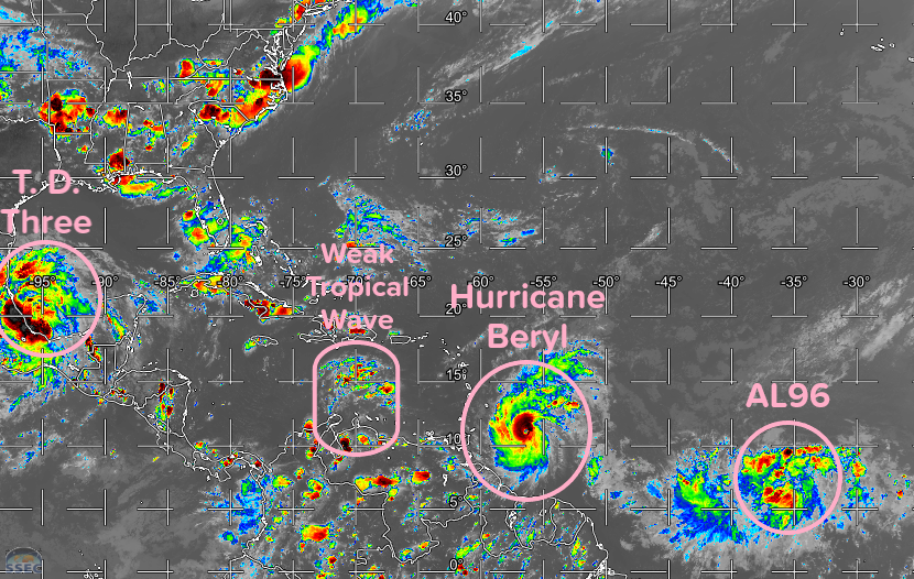 Finally, another area of disturbed weather to watch is east of Beryl over the tropical Atlantic, Invest Area AL96. Following in Beryl’s footsteps, it won’t have quite the excellent set of conditions that allowed Beryl to go into Beast Mode as it drifts westward this week. However, there is a good chance (70% according to the National Hurricane Center) of becoming a tropical cyclone over the next week. Early signs are that it will take the low road through the Caribbean Sea as Beryl will, but it’s too early to promise it will never affect South Carolina.