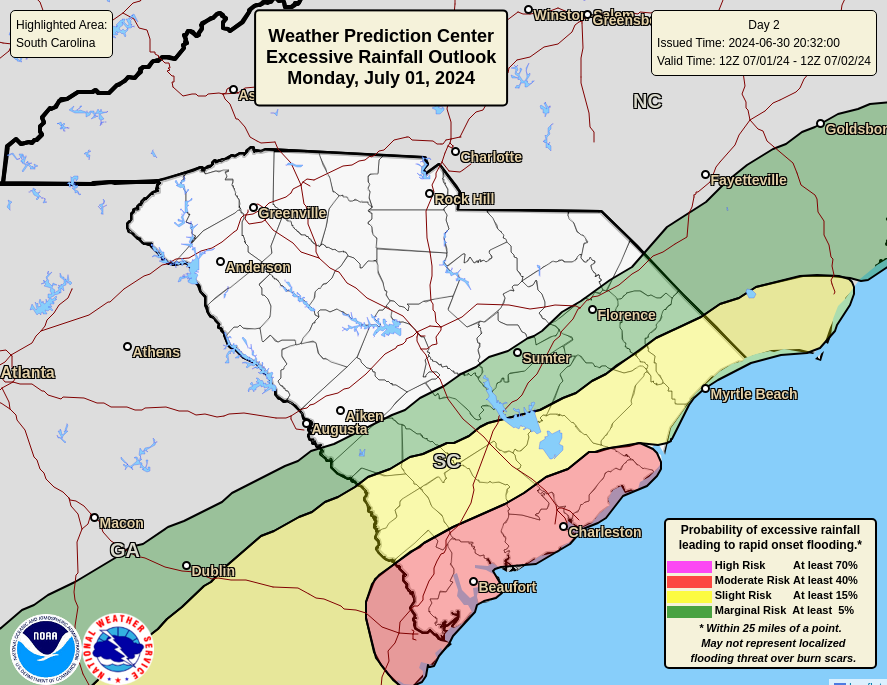WPC’s Excessive Rainfall Outlook graphic for Monday with South Carolina highlighted indicates up to a level 3 of 4 risk of enough rain for flash flooding.